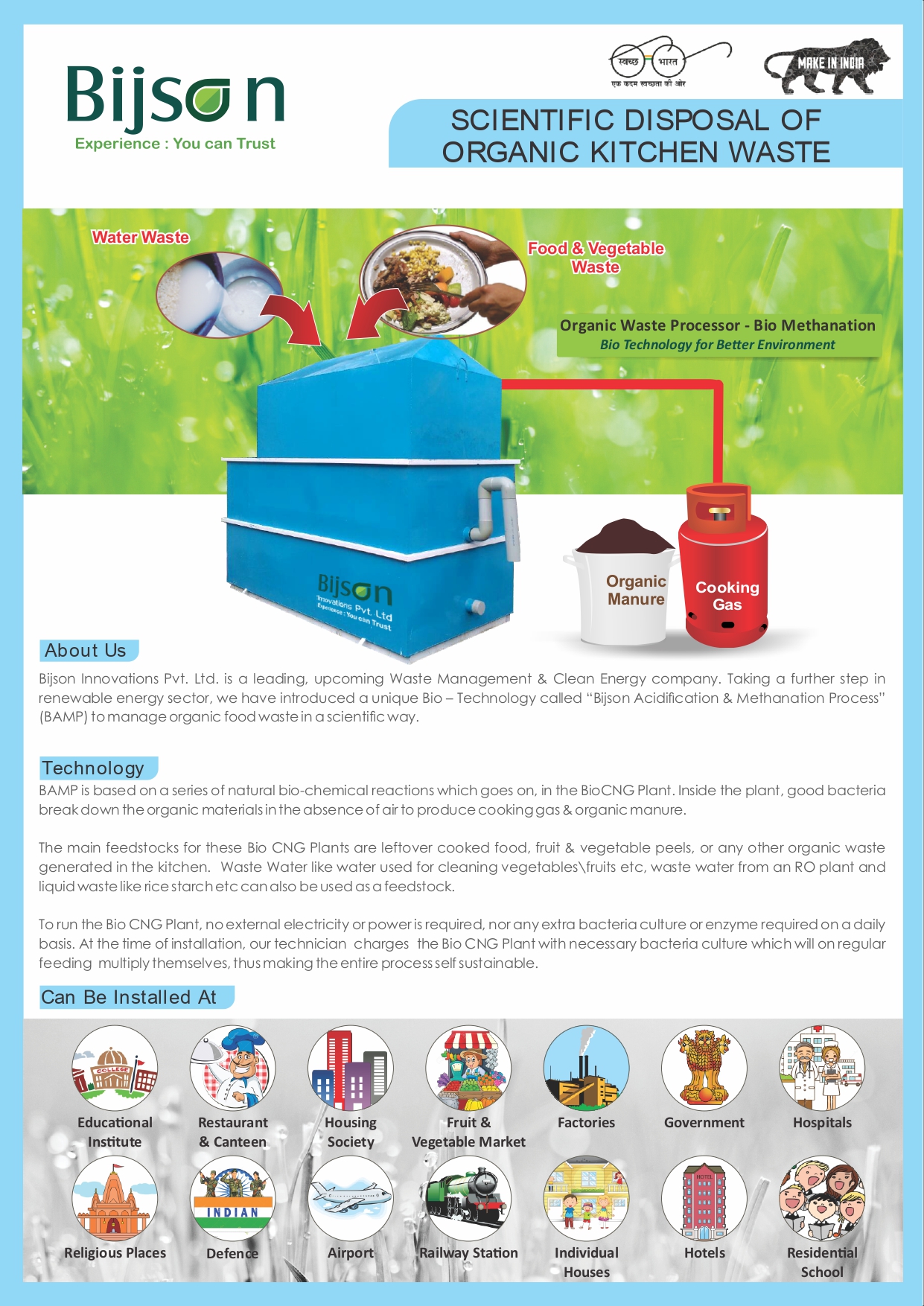 Organic waste is put into a sealed tank called BioCNG plant. where it is heated and agitated. In the absence of oxygen anaerobic bacteria consume the organic matter to multiply and produce biogas.
